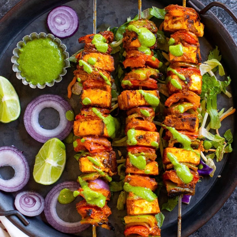 Paneer (Hüttenkäse) mariniert in einer milden und schmackhaften Tandoori-Gewürzmischung, gegrillt bis zur Perfektion.